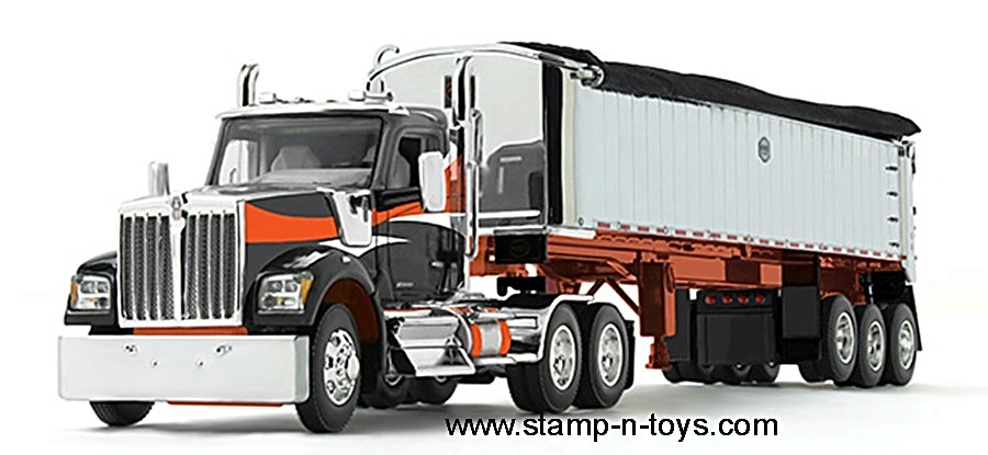 1st Gear/DCP 1/64 scale Kenworth W-990 daycab pulling a chrome MAC 3-A Coal Dump Trailer. The KW features an opening hood with detailed engine, working suspension, and many aftermarket options. The Trailer is a MAC coal dump trailer w/tri-axles and black tarp. Outstanding detail and very authentic. Comes new in the box. Click on the magnifying glass in the picture for a larger view.