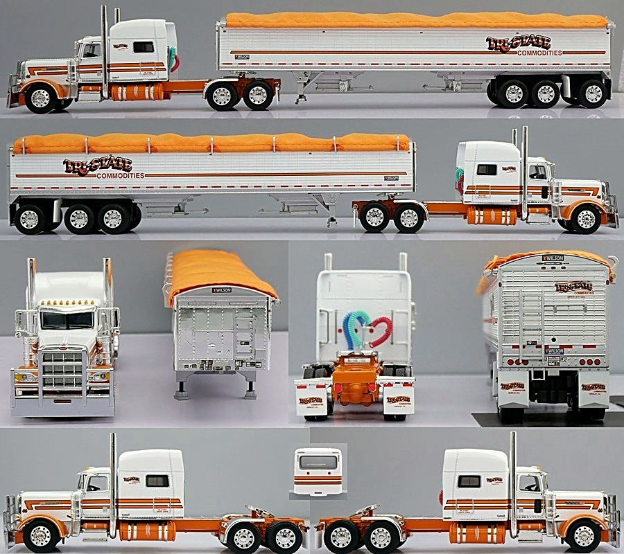 1st Gear/DCP 1/64 scale Tri-State Commodities Peterbilt 389 w/70" sleeper pulling a Tri-Axle Wilson Hopper Bottom Grain Trailer. Outstanding detail and very authentic. Comes new in the box. Click on the magnifying glass in the picture for a larger view.