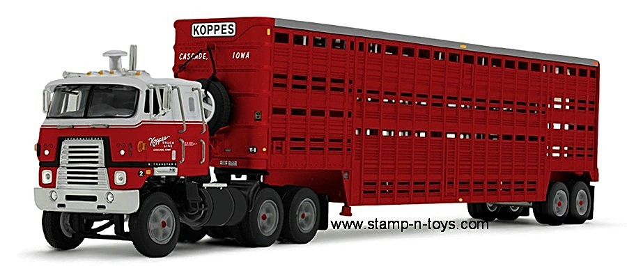 1st Gear/DCP 1/64 scale I H Transtar II pulling a closed tandem-axle Wilson Silverstar Cattlepot. Decoration on this truck represents a vintage Koppes Truck Lines Cattle Truck. Outstanding detail and very authentic. Comes new in the box. Click on the magnifying glass in the picture for a larger view.