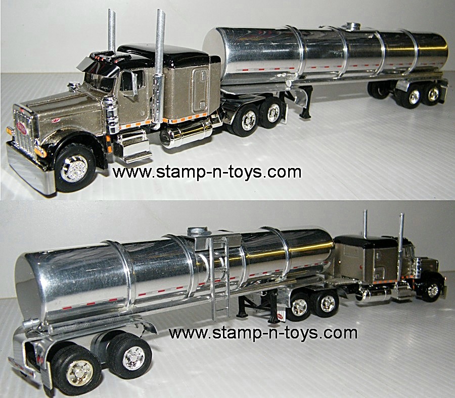 TLC/custom aluminum 1/64th scale Vintage Truckin-Little Peterbilt 379 w63" sleeper pulling a custom made polished Aluminum Ribbed Tanker. The Pete cab features two tone paint, stainless steel Texas bumper, visor, aluminum stacks w/beveled ends, vintage wire mirrors, and polished steel half fenders. The trailer is custom made from aluminum. Chrome rims are from Spec Cast. Outstanding detail and very authentic. The tractor and trailer are packaged in plastic clamshells and a DCP black box. Click on the magnifying glass for a larger picture.