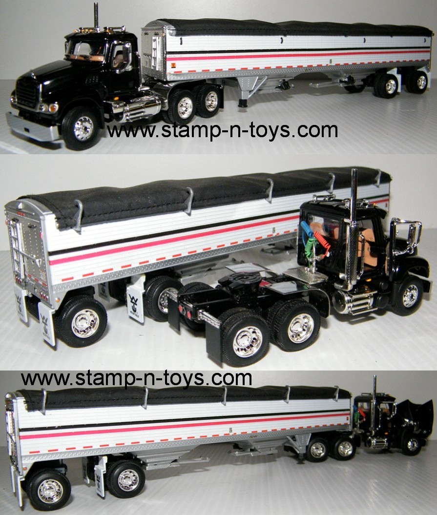 Custom 1st Gear/DCP Mack Granite Daycab pulling a custom Wilson spread-axle Hopper Bottom Grain Trailer. The Mack features opening hood w/detailed motor, opening doors w/detailed cab interior, custom pogo stick, and stainless steel half fenders. The DCP Wilson trailer has custom spread axles. Outstanding detail and very authentic. Click on the magnifying glass in the picture for a larger view.  Comes in a DCP box with individual clamshells for the tractor and trailer.