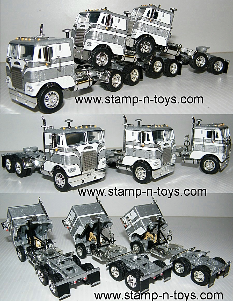 1st Gear/DCP 1/64th scale White-Freightliner cabover set of 3 cabs. The air/electrical lines have been included in the mirror bag taped to the back of the clamshells. You can install them on the tractor chassis if desired. Chrome wheels all around. Click on the magnifying glass in the picture to see more detail. Outstanding detail and very authentic. Comes in a DCP Black box. Clamshell maybe split between cab and trailer.