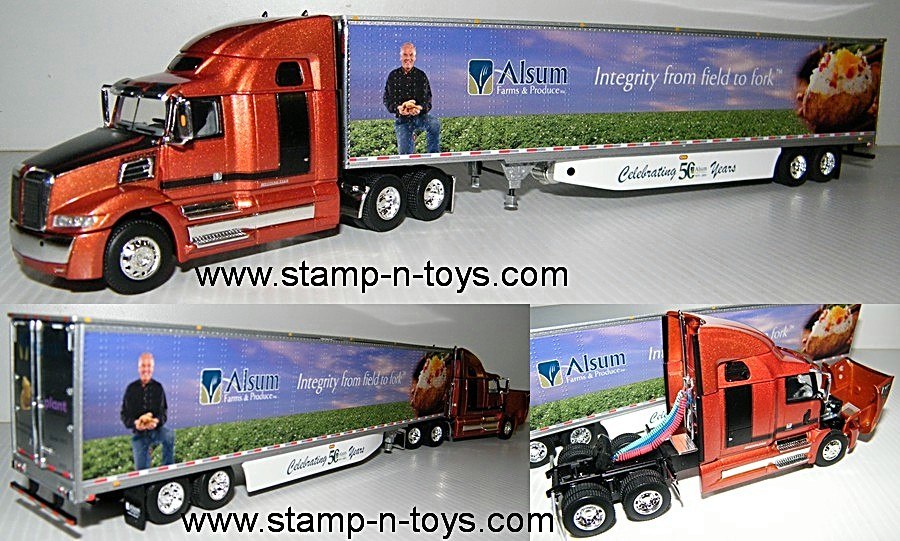 1st Gear/DCP 1/64th scale Western Star 5700 tractor w/68" high roof sleeper pulling a 53' Reefer Van Trailer w/Thermo-King Reefer Unit. The graphics are for Alsum Farm & Produce celebrating 50 Years 1973 - 2023. The air/electrical lines have been pulled back and attached under the fifth wheel to simulate being hooked up to the trailer. Outstanding detail and very authentic. Comes in protective clamshells inside a black DCP Box, Click on the magnifying glass in the picture for a larger view.