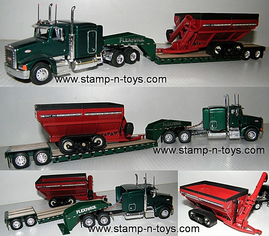 Spec Cast/1st Gear/DCP/Flexhaul custom Peterbilt w/63" sleeper pulling a Flexhaul 2-axle Lowboy w/detachable gooseneck. The trailer has real wood decking and a closed deck over the rear wheels. The cab has a custom sleeper, CB antennas, custom pipes, and pogo stick with the air/electrical lines pulled back and attached under the fifth wheel to simulate hook-up to the trailer. The Brent 1084 grain cart is on tracks. Outstanding detail and very authentic. Will be packaged carefully for shipment.