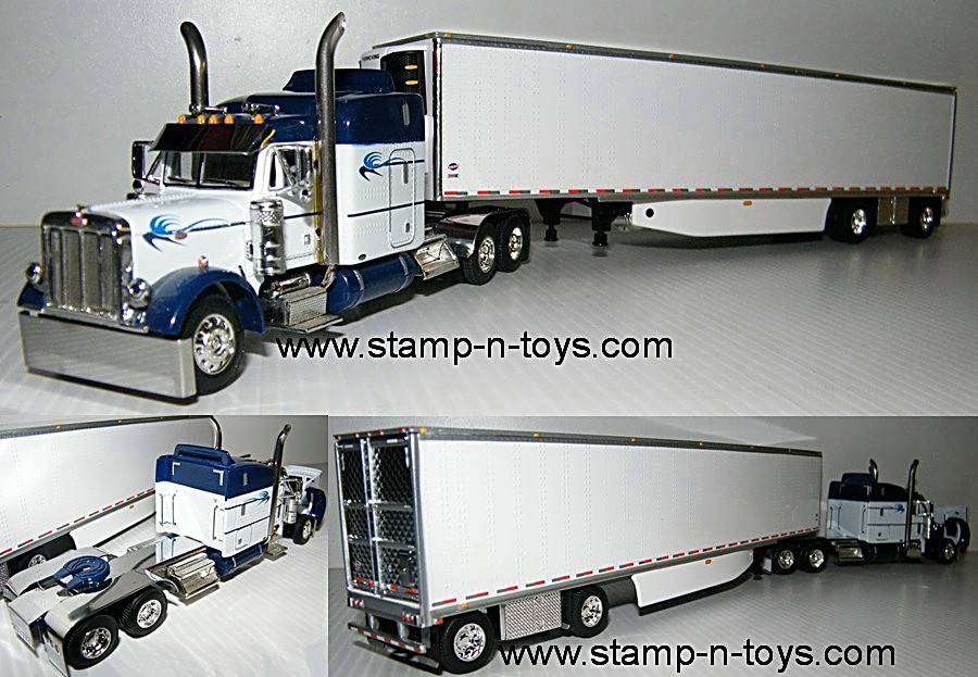 First Gear/DCP 1/64th scale Custom Peterbilt 379 w/ 63" RR sleeper pulling a 53' Utility spread-axle w/Thermo-King Reefer, Side Skirts, Chrome Toolboxes & Quilted Rear Doors. The Pete features a Stainless Steel Texas Bumper, Visor, Straight Stacks w/curved ends, Deck & Tailplates, full rear fenders, and KW chrome steps to the deck, and mudflap & light graphics. Matching chrome wheels all around. Outstanding detail and very authentic. Click on the magnifying glass in the picture for a larger view. The truck will be packaged in original clamshells in a DCP black box to prevent damage during shipping.