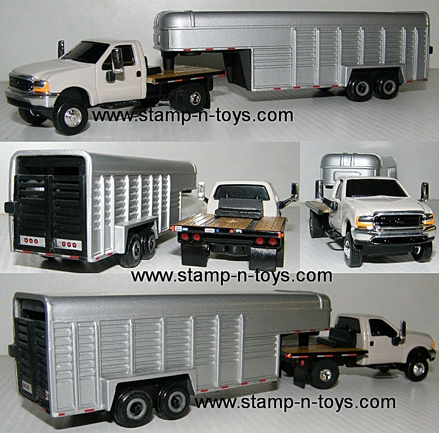 Ertl/Tomy 1/64 scale Ford F-350 custom flatbed pulling a gooseneck livestock tandem axle trailer. The truck has a custom flatbed, 4WD, Duals on the rear, external fuel tank, mirrors, running boards, and mudflaps. Outstanding detail and very authentic. The Truck/Trailer wrapped in bubble wrap for protection during shipping. Click on the magnifying glass in the picture for a larger view.