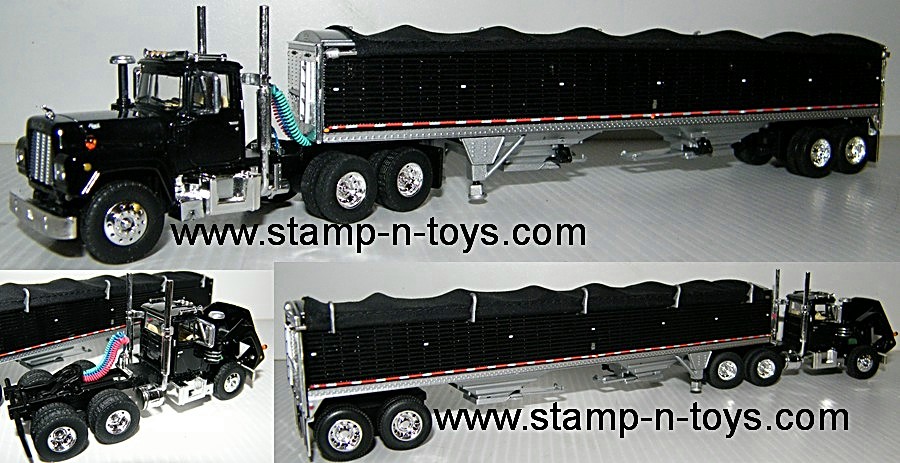 1st Gear/DCP 1/64 scale Mack R-Model Day Cab pulling a Wilson 42' Pacesetter Hopper Bottom Trailer. Features include opening hood, detailed engine, custom pogo stick, dual chrome tanks and the air/electrical lines have been pulled back to simulate being attached to the trailer. Outstanding detail and very authentic. The Truck/Trailer comes in protective clamshells in a DCP Black Box for protection during shipping. Click on the magnifying glass in the picture for a larger view.