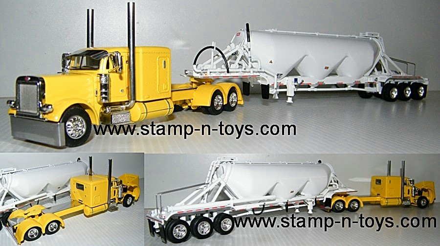 1st Gear/DCP 1/64 scale custom painted Peterbilt 379 w/63" flat top sleeper pulling a tri-axle Heil 3-bay Pneumatic Tank Trailer. The Peterbilt has stainless steel Texas bumper, straight stacks, visor, deck, and tail plates. The trailer has all the features of the Heil Pneumatic Tankers. Outstanding detail and very authentic. Chrome wheels all around. The Truck/Trailer comes in protective clamshells in a DCP Black Box for protection during shipping. Click on the magnifying glass in the picture for a larger view.