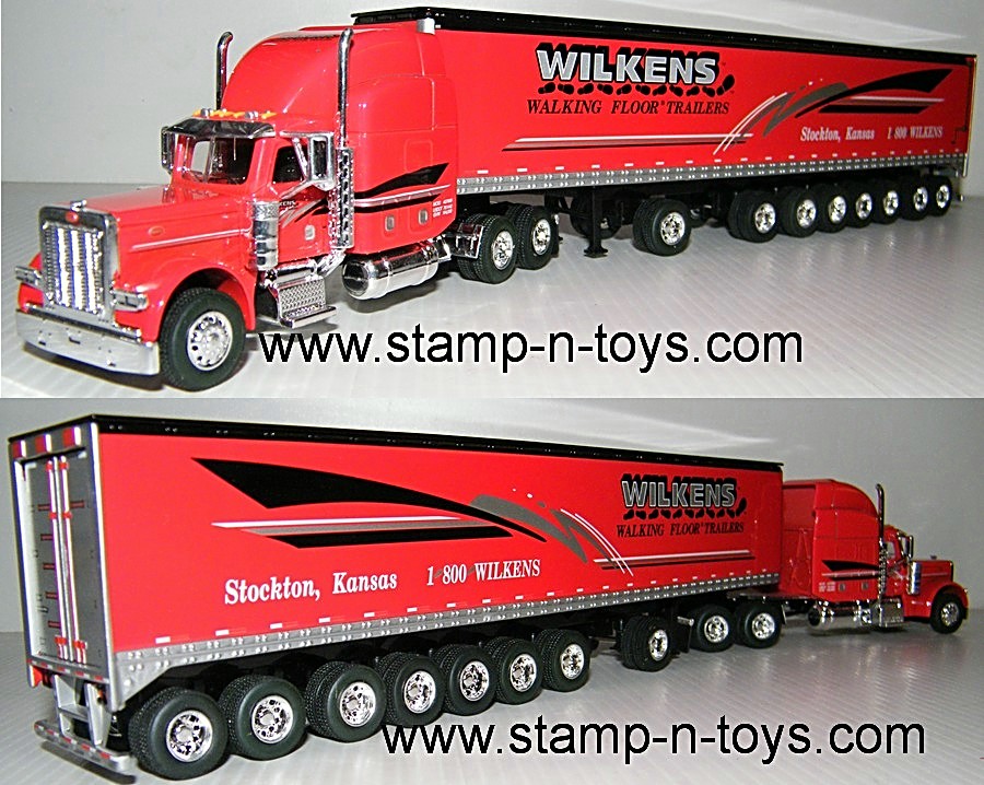 Spec Cast, 1/64th scale Peterbilt 379 tractor pulling an eight-axle 53' trailer. Produced for Wilkens walking floor trailers of Stockton, KS. Number 1202 of 1260 made Purchased in a collection. Outstanding detail and very authentic. Box has shelf-wear, the truck is in excellent condition. Be sure to click on the magnifying glass in the picture for a larger view of this fantastic Truck.