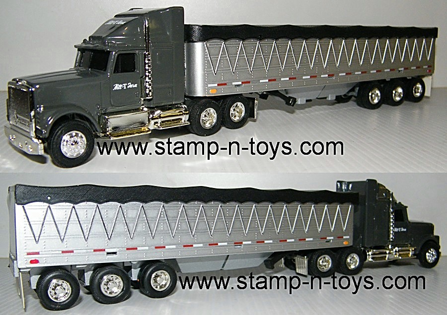 Ert1/64th scale International Harvester 9400 Conventional Tractor pulling a custom Ertl 3-axle hopper bottom grain trailer. The IH 9400 w/"Hill-T-Farms" graphics is by Ertl, as is the Trailer. Features include custom axles, D.O.T. stripes, and authentic hand detailing. Outstanding detail and very authentic. Comes in a DCP Black Box with tissue paper & bubblewrap protection for the tractor/trailer. Click on the magnifying glass in the picture for a larger view.