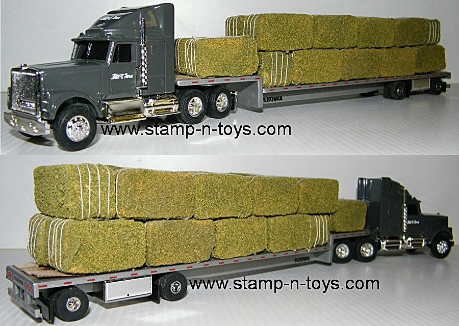 Ertl/Flexhaul1/64th scale International Harvester 9400 Conventional Tractor pulling a Flexhaul Spread Axle Step Deck Trailer with 4' x 8' Haybale load. The IH 9400 w/"Hill-T-Farms" graphics is by Ertl, the Trailer is by Stamp-n-Toys/Flexhaul. Features include real wood decking, D.O.T. stripes, and authentic haybales. The bales are permanently attached to the trailer. Outstanding detail and very authentic. Comes in a DCP Black Box with tissue paper & bubblewrap protection for the tractor/trailer. Click on the magnifying glass in the picture for a larger view.