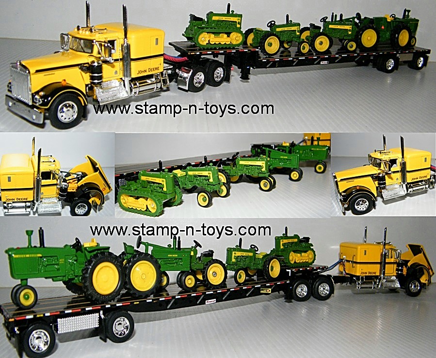 1st Gear/DCP, 1/64th scale Kenworth W-900A w/63" flattop sleeper pulling a Wilson Transcraft 53' s/a stepdeck w/John Deere vintage tractor load. The KW features John Deere logos on sides of sleeper and the air/electrical lines have been pulled back and affixed under the fifth wheel to simulate hook-up to the trailer. The John Deeres were produced by Ertl/Tomy and include one each 4010 NF Diesel, 430 NF,330 WF, B NF, and 430 crawler. Outstanding detail and very authentic. Will be packaged carefully for shipment. Click on the magnifying glass in the picture for a larger view.