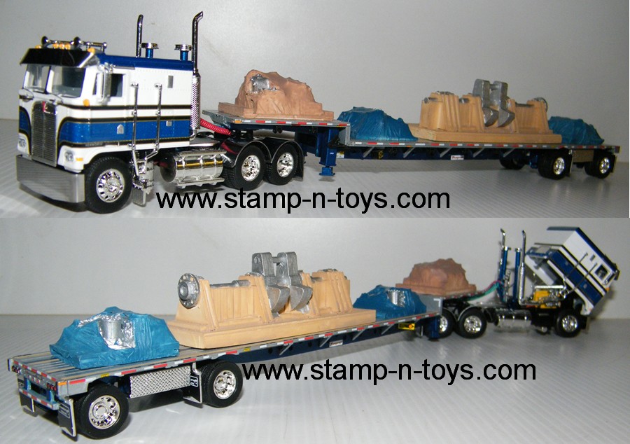 1st Gear/DCP 1/64th scale Kenworth K-100 COE Tractor pulling a matching Wilson Transcraft stepdeck w/resin cast machinery parts load. The KW has the air/electrical lines pulled back and attached under the fifth wheel to simulate hook-up to the trailer. Custom stainless steel visor, Texas Bumper and hump fenders have also been added.. Chrome 10-hole polished wheels complete the package. Outstanding detail and very authentic. Will be packed very carefully for shipment.