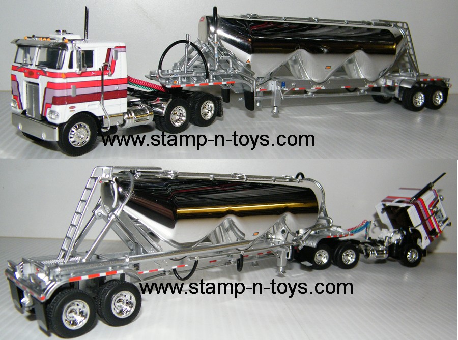 DCP/1st Gear 1/64th scale Peterbilt 352 COE Tractor pulling a Heil 3-bay Pneumatic Tanker. The air/electrical lines have been pulled back under the fifth wheel to simulate hook-up to the trailer. Outstanding detail and very authentic. Comes in a DCP box with correct clamshell for the tractor and trailer. Click on the magnifying glass in the picture for a larger view.