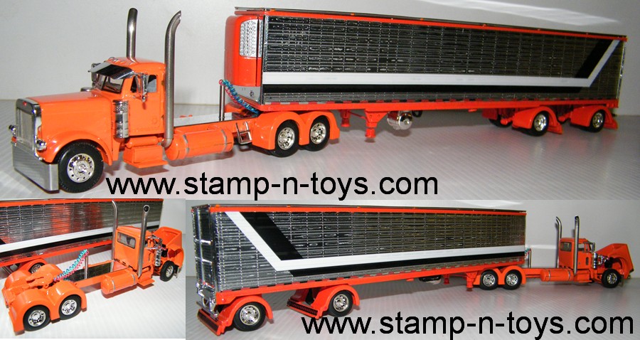 1st Gear/DCP, 1/64th scale. Custom Peterbilt 379 Day Cab pulling a 53' spread-axle reefer trailer. The Pete tractor features stainless steel stacks w/curved ends, visor, Texas bumper, deck plate, pogo stick, dual breathers, chrome horns, breather covers, tanks, custom fenders, detailed interior, , detailed engine and the air/electrical lines have been pulled back and attached under the fifth wheel to simulate hook-up to the trailer. The Chrome 53' Trailer has matching custom orange paint and graphics and fenders w/light detail like the cab. Chrome wheels all around. Click on the magnifying glass in the pic for a larger view. Outstanding detail and very authentic. Comes in a DCP Black box. Clamshell maybe split between cab and trailer.