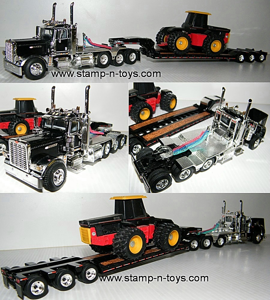 1st Gear/DCP 1/64th scale. Peterbilt 389 "first in class Daycab w/3-drive axles pulling a Talbert 3-axle lowboy w/a Versatile 1st edition 4WD Tractor for the load. Custom air/electrical lines have been added and stretched to the fifth wheel to simulate hook-up to the trailer. The Versatile "1st edition" 4WD Farm Tractor w/duals is by Scale Models. Outstanding detail and very authentic. Comes new in a DCP black box with individual plastic clamshells for each piece. Click on the magnifying glass in the picture for a larger view.
