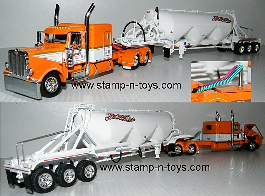 1st Gear/DCP 1:64th scale Peterbilt 389 with Tri-State Commodities (TSC Logos) pulling a 3-axle Heil Pneumatic Tank Trailer. The Pete features lots of aftermarket accessories along with a stainless steel pogo stick and air/electric lines that have been pulled back and attached under the fifth wheel to simulate hook-up to the trailer, dual chrome mule-ear stacks, tilting hood, detailed motor, 5-position steer wheels, and chrome steps and battery boxes, and full tandem hump fenders. Detail on the trailer is outstanding as seen in the pictures. Nice detail and very authentic. Will be packed carefully for shipment. Click on the magnifying glass in the picture for a larger view..
