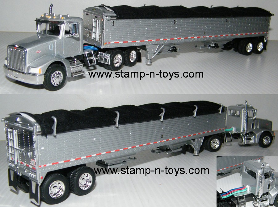 DCP/1st Gear/Spec Cast 1/64th scale Peterbilt 385 day cab pulling a DCP silver 43' Wilson Pacesetter hopper-bottom Grain Trailer. The Pete tractor features custom air-electrical hoses. The trailers feature detailed landing gear, tandem-axles w/suspension, black cloth tarp, and matching chrome rims. Click on the magnifying glass for a larger view. Outstanding detail and very authentic. Comes in a DCP Black boxes and clamshells.
