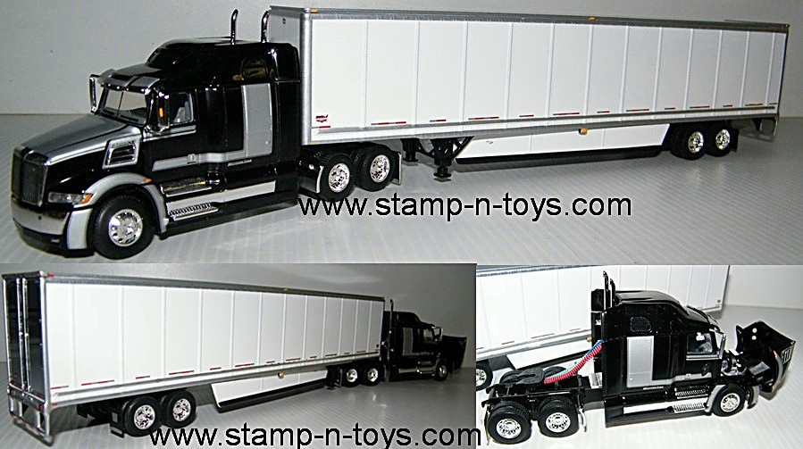 1st Gear/DCP 1/64th scale Western Star 5700 tractor w/68" raised roof sleeper pulling a Wabash vertical ribbed 53' Dry Van Trailer The air/electrical lines have been pulled back and attached under the fifth wheel to simulate being hooked up to the trailer. Outstanding detail and very authentic. Comes in protective clamshells inside a black DCP Box, Click on the magnifying glass in the picture for a larger view.