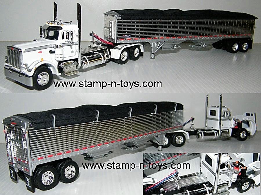 1st Gear/DCP 1/64th scale Peterbilt 359 day cab pulling a chrome Wilson 43' high sided hopper-bottom grain trailer. The Pete features chrome deckplate & pogo stick, chrome tanks and much more. Chrome wheels all around. The air/electrical lines have been pulled back and attached under the fifth wheel to simulate being hooked to the trailer. The Wilson Pacesetter grain trailer has chrome sides and ends w/black tarp. Outstanding graphics and detail. Will be packed very carefully for shipment Click on the magnifying glass in the picture for a larger view.